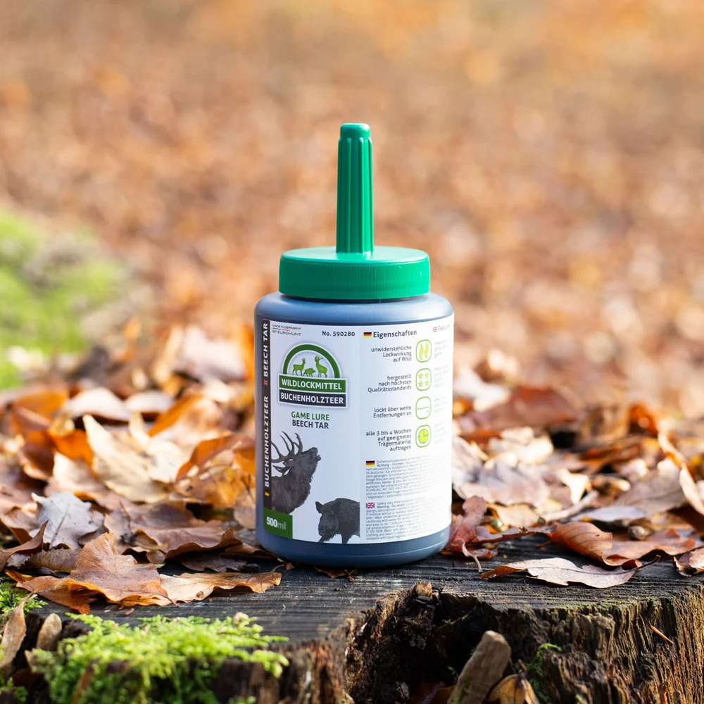 EUROHUNT bukov katran je čisti bukov katran, bez aditiva ili feromona. Privlači divlje svinje i jelene na velike udaljenosti i vrlo se lako obrađuje zbog svoje srednje konzistencije. Odličan je za farbanje drveća i hranilišta. Iznenadit ćete se koliko brzo ovaj dobro provjereni bukov drveni katran privlači divljač svojim jedinstvenim efektom privlačenja. Vrhunski kvalitet od 2 puta ključalog bukovog drvenog katrana.
