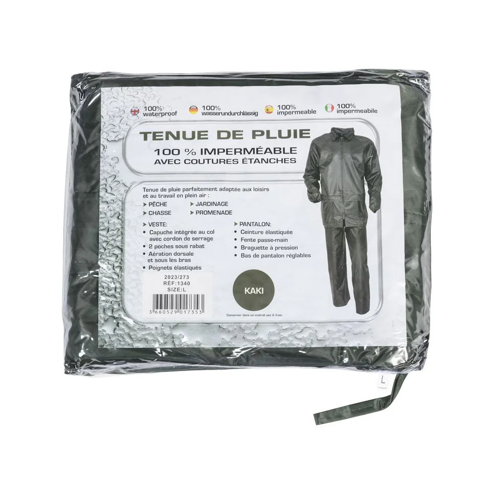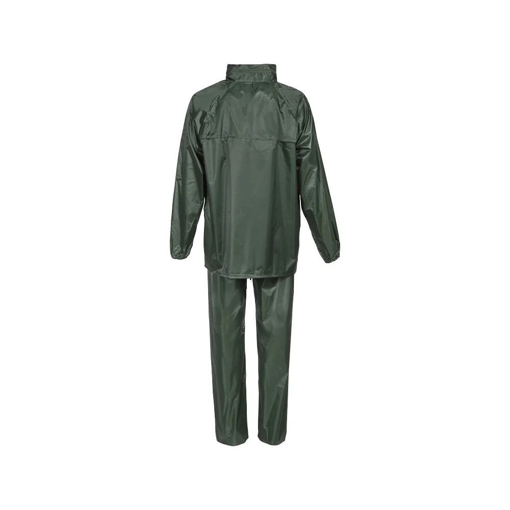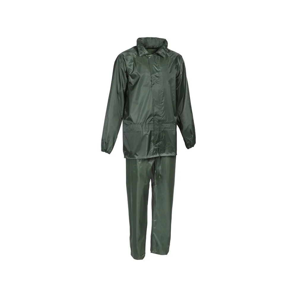 100% poliester s PVC premazom, zalijepljeni šavovi. Jakna s 2 džepa i hlače s vezicom u struku s prorezima za ruke, elastični struk